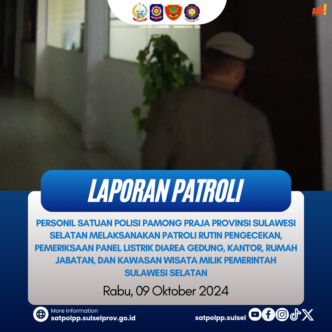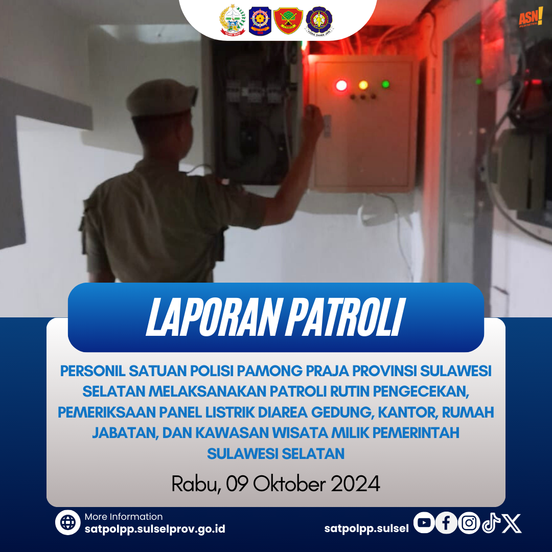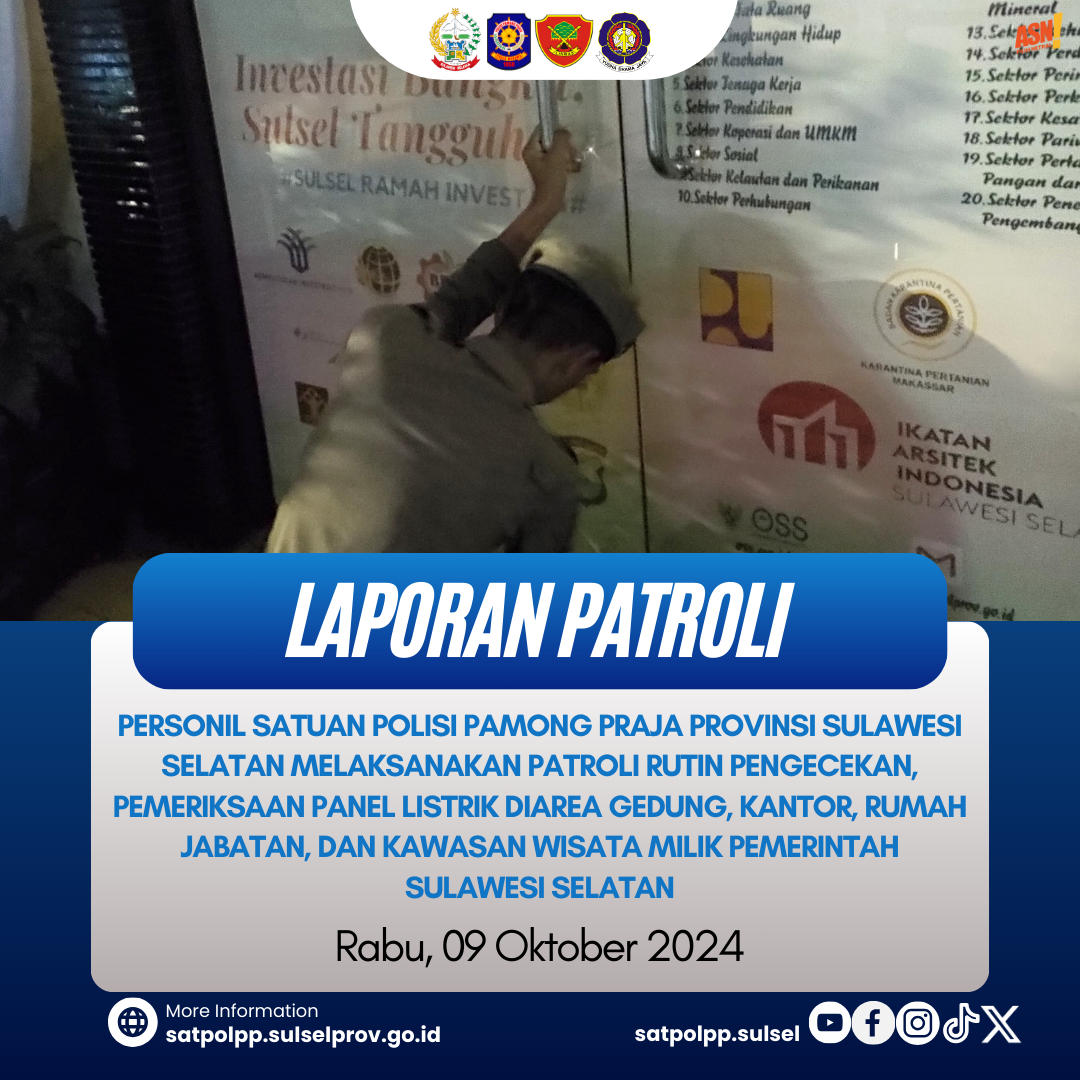 Personil Satuan Polisi Pamong Praja Provinsi Sulawesi Selatan melaksanakan patroli rutin pengecekan, pemeriksaan panel listrik diarea Gedung, Kantor, Rumah J...