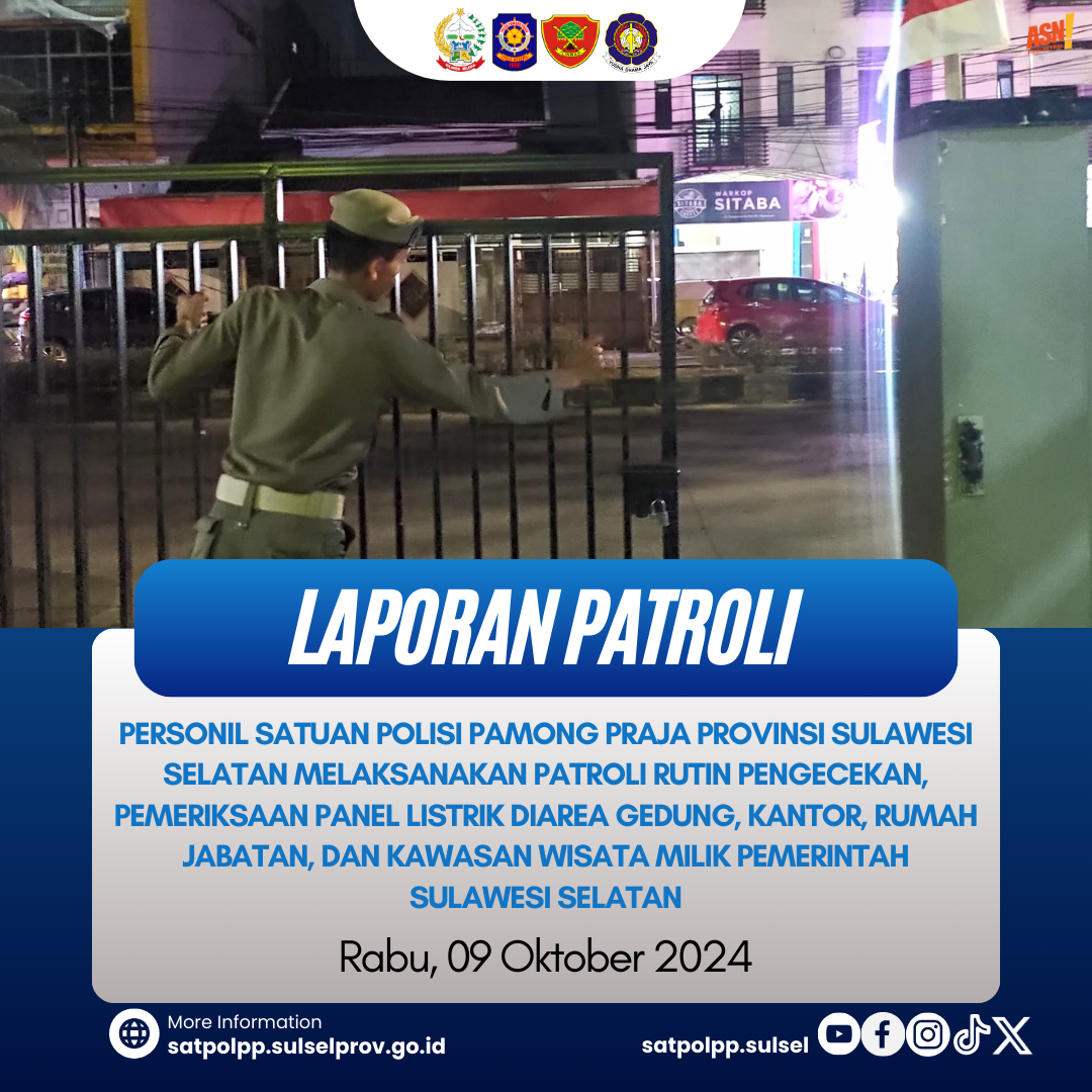 Personil Satuan Polisi Pamong Praja Provinsi Sulawesi Selatan melaksanakan patroli rutin pengecekan, pemeriksaan panel listrik diarea Gedung, Kantor, Rumah J...