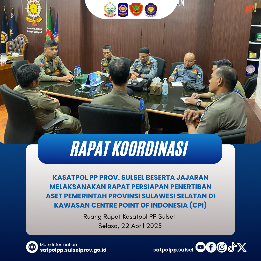 Kasatpol Pp Prov. sulsel beserta jajaran melaksanakan Rapat Persiapan Penertiban Aset Pemerintah Provinsi Sulawesi Selatan di Kawasan Centre Point of Indones...