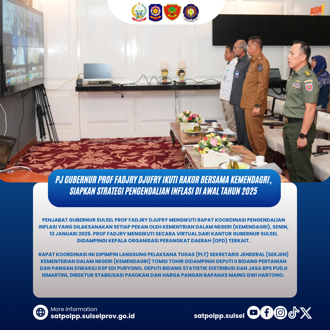 MAKASSAR - Penjabat Gubernur Sulsel Prof Fadjry Djufry mengikuti Rapat Koordinasi Pengendalian Inflasi yang dilaksanakan setiap pekan oleh Kementrian Dalam N...