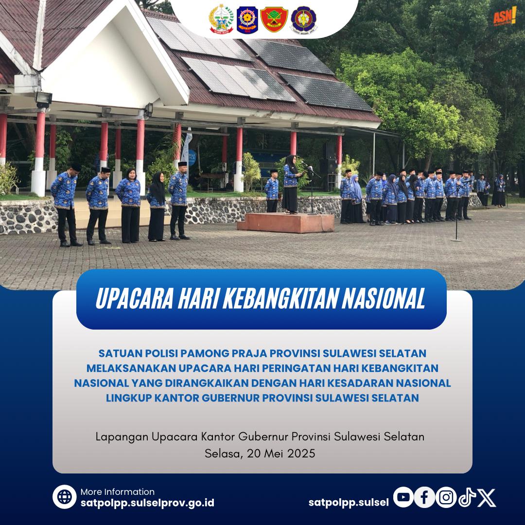 Satuan Polisi Pamong Praja Provinsi Sulawesi Selatan Melaksanakan upacara hari Peringatan Hari Kebangkitan nasional yang dirangkaikan dengan Hari Kesadaran N...